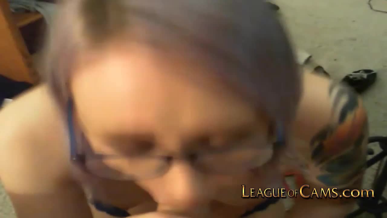 Gothic teen with glasses flashes shaved pussy on cam, blowing a stranger until he bursts with cum.