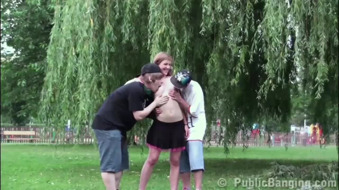 daring public threesome with petite 18-year-old teen in wild outdoor banging scene.