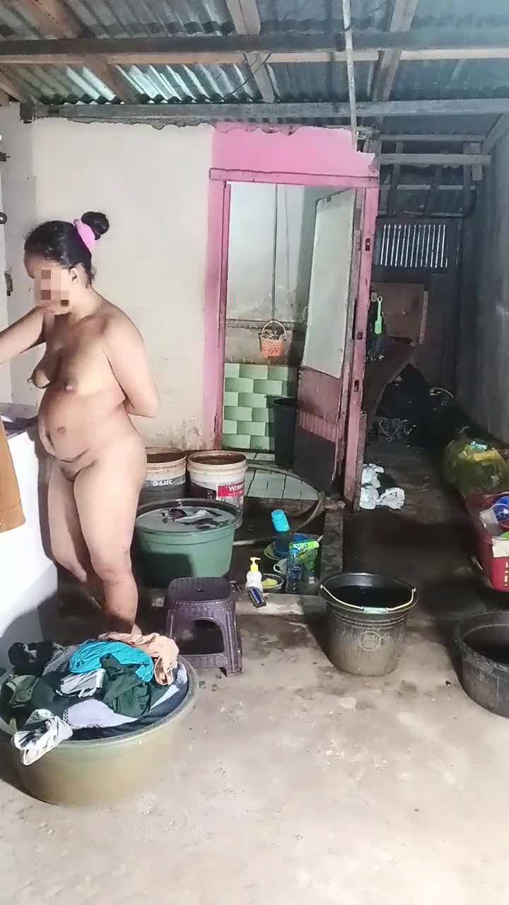 Indonesian housewife washes clothes while masturbating big pussy
