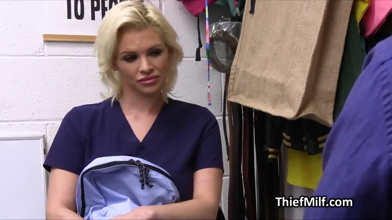 Nurse catches thief and bangs her big tits from behind in backroom